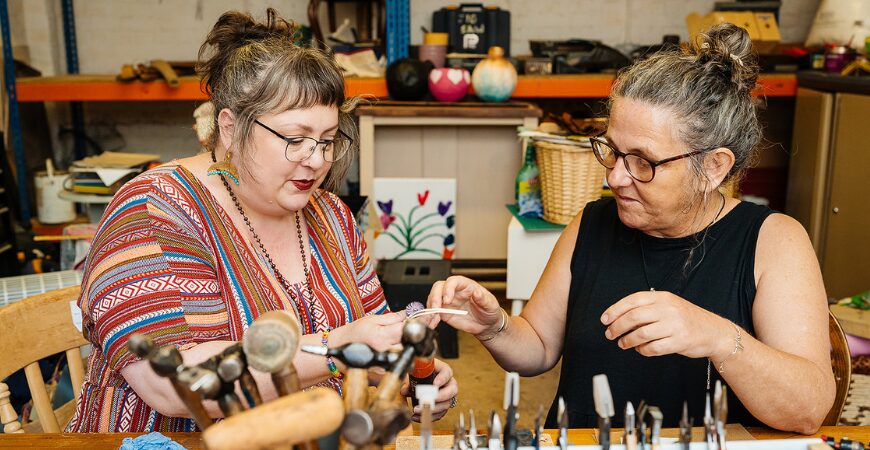 Les femmes participent également à des activités créatives : forge, travail du textile et gravure. Nous avons délibérément choisi des activités qui bousculent les stéréotypes de genre. Je voulais que les femmes travaillent dans notre forge avec des marteaux et du feu, et pas seulement dans l’artisanat traditionnel. Le travail textile a aussi été exceptionnel : linogravure, broderie, elles ont réalisé de magnifiques objets. Au mois d’octobre, nous avons ouvert une boutique dédiée aux femmes afin d’exposer leurs créations. Les femmes travaillent également dans les entreprises sociales de la communauté principale.